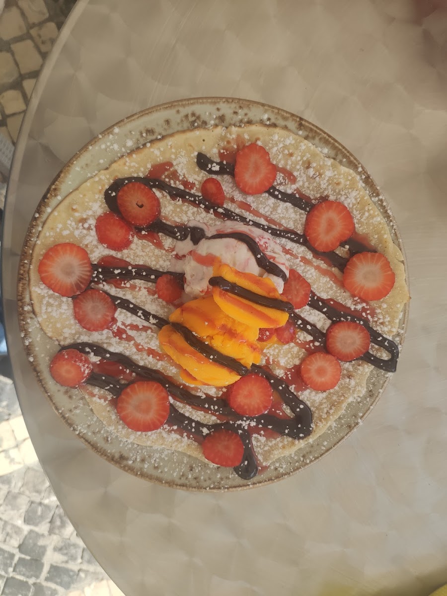 Fans of sweet delights will love the artisanal crepes, such as the crowd's favorite with double scoops of ice cream, pairing indulgent cheesecake with the refreshing tang of Greek yogurt, all beautifully garnished with ripe mango and fresh strawberries. Customer Carlos Camisao enthusiastically shared his experience: “Como um crepe com duas bolas de gelado... combinação perfeita.” Add to that a refreshing mango smoothie, and you've got a sweet moment that lingers on your taste buds.